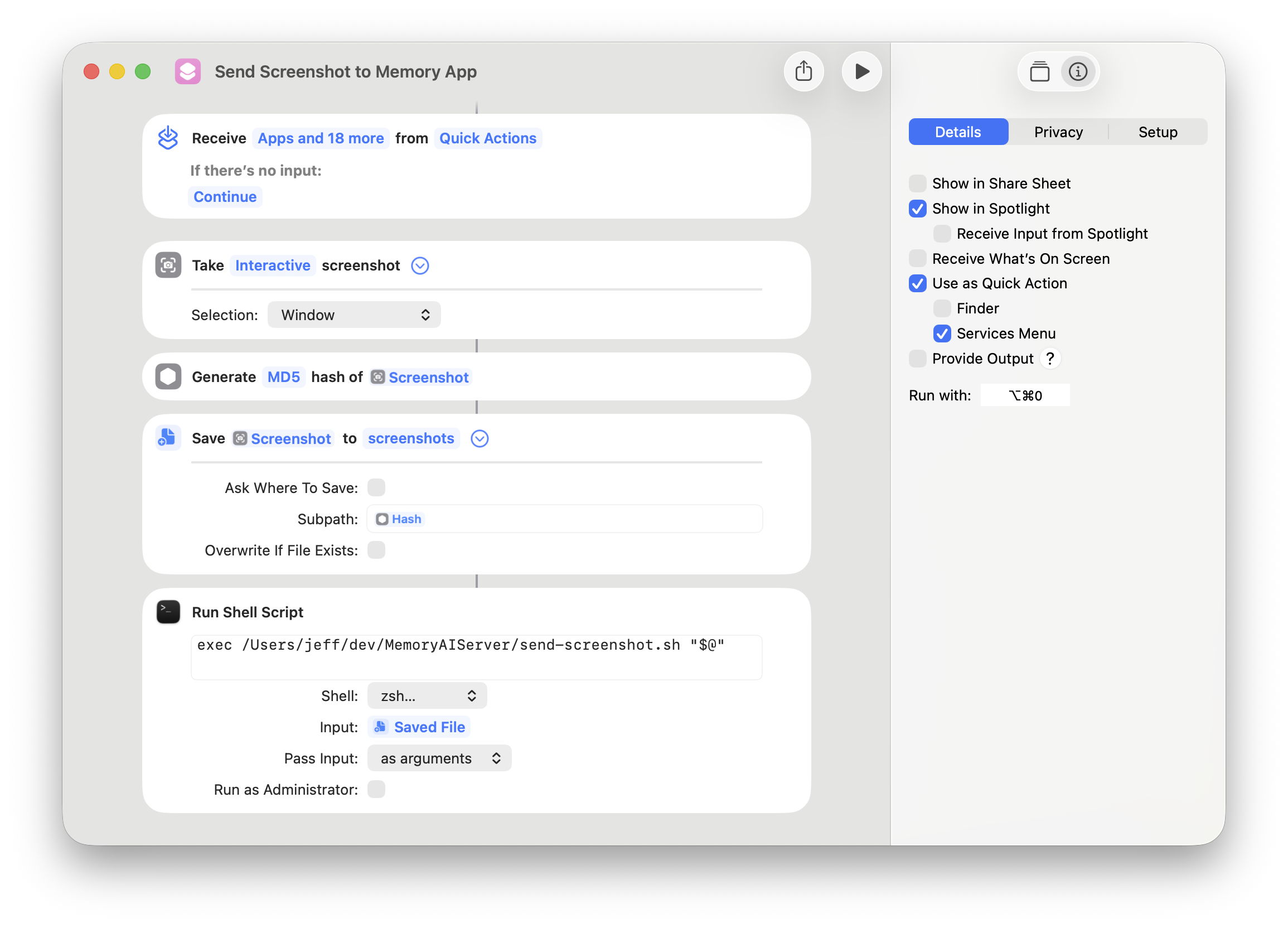 The Run with: option in the right pane even allows you to assign a keyboard shortcut. With this functionality, I could completely replace the Mac app and rely on this shortcut instead. All I’d need to develop is a small script that accepts the screenshot file and uploads it directly to my web app.