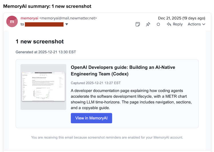 - The existing email reminder system could be adjusted to query Memos for new screenshots on my desired schedule, just like the web app
