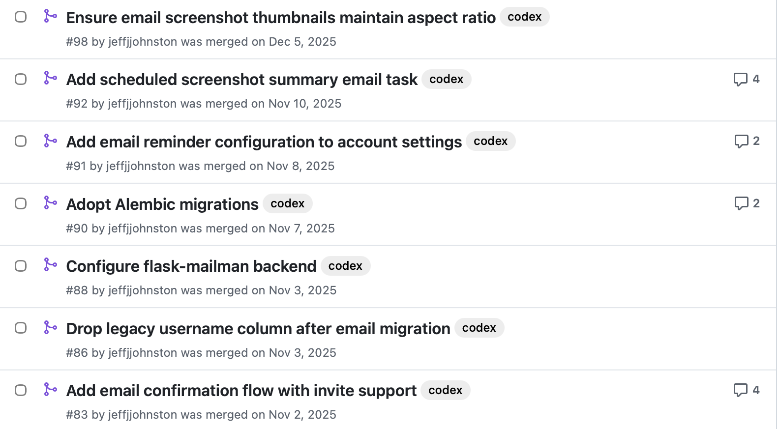 Building the web app was very educational. I relied heavily on ChatGPT Codex cloud’s asynchronous tasks, allowing me to request specific features and enhancements and then review the coding agent’s proposed changes in the form of GitHub pull requests. The agent helped me develop an automated deployment strategy for pushing new versions from GitHub to the Amazon EC2 instance hosting the app. Looking at the private repo now, there are 75 pull requests with the codex label. Here are just a few:
