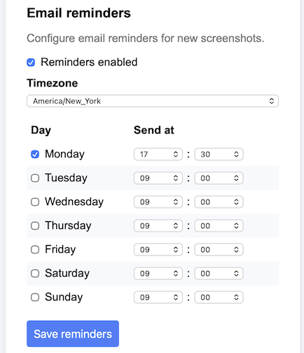While using this iteration of the app, I decided that it would be very useful if the app could send me emails on a specific schedule reminding me of all the new screenshots I had added since the previous email. This was a complex undertaking involving significant configuration in both Amazon Web Services and Cloudflare, where my domain is hosted. The result was a simple UI and a backend scheduling and email sending system:
