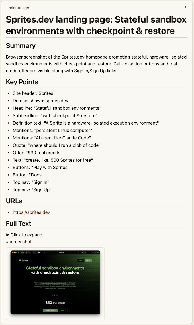 Now, the tool would be capturing a screenshot of the browser, not a URL. But is that really a downside? The browser screenshot will help with my second requirement: additional context. And the fact that it is a screenshot image and not text is not at all important - because we have at our disposal powerful multimodal AI models that can easily extract text from screenshots!