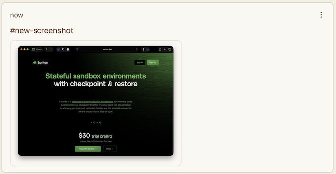 Addressing these limitations would turn the tool into a more general-purpose notes database that could handle more than just screenshots. Adding UI code to allow for editing rich text and defining new, non-screenshot records in the database didn’t strike me as the best way forward. I eventually asked myself - does this need to be a standalone tool, or could it instead be a feature of a larger, more capable app? The critical feature is the ability to quickly capture a screenshot and use an AI model to annotate it with additional context. What sort of existing app might benefit from this feature?